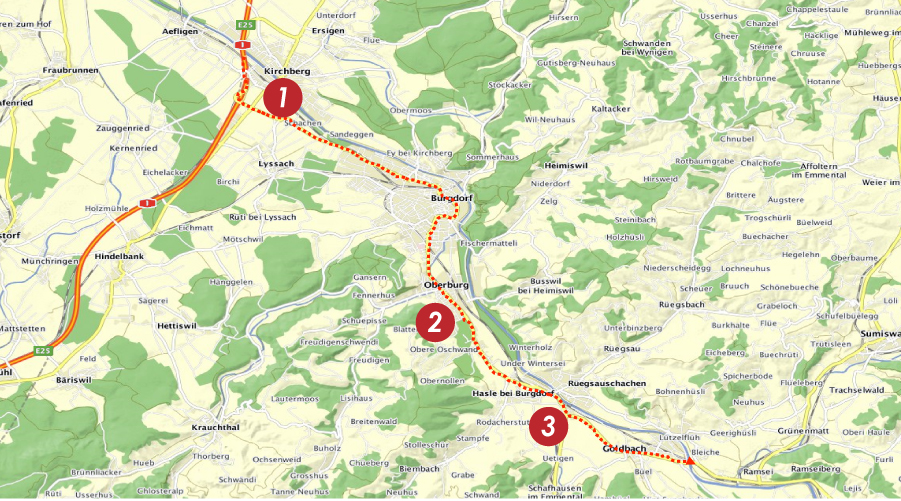 1. Nehmen Sie die Autobahnausfahrt Kirchberg; Richtung Burgdorf / Langnau