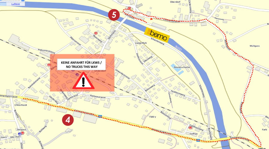 Wegbeschrieb für LKW zum bemo Lager in Lützelflüh - Punkte 1. bis 5. sind auf Karte/Bilder eingetragen