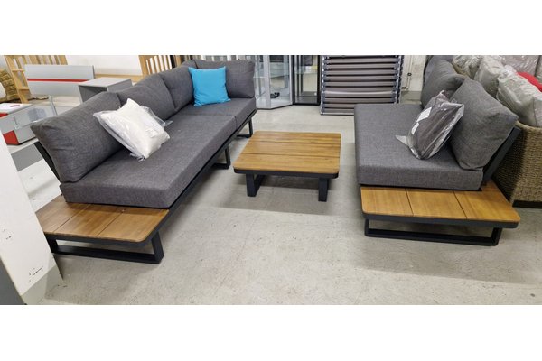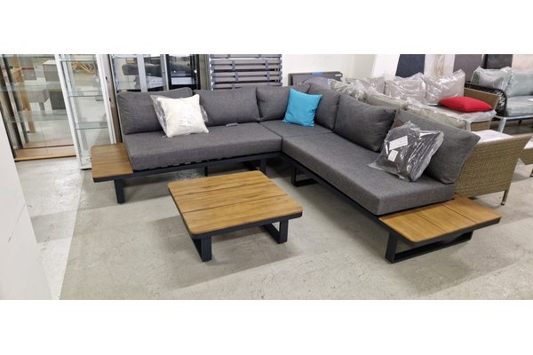 Aluminium Gestell, pulverbeschichtet Schwarz. Akazienholz. Tisch Masse 77x77cm